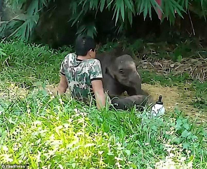 ANAK gajah Chabakeaw dirakam berbaring di atas riba seorang penjaga untuk tidur di Bueng Kan, Thailand baru-baru ini.
