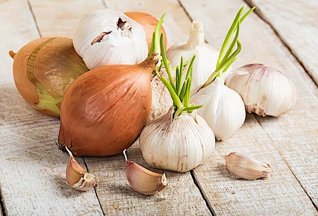 Gambar menunjukkan bawang merah dan bawang putih di atas sebuah meja.