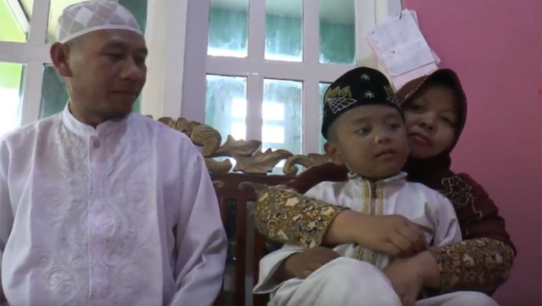 Muhamad Zidan Fajril Ilmi (6) dipangku ayahnya, Muhaimin. Bocah asal Dusun Krajan, Desa Puspo, Pasuruan itu memiliki bola mata lima warna dan selalu beruah-ubah. (Foto: iNews.id/Jaka Samdura)