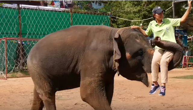Semasa membuat persembahan, gajah tersebut dilihat memusingkan gelung rotan menggunakan belalainya dan berdiri di atas kerusi sebelum dipaksa membaling sebiji bola ke dalam jaring.