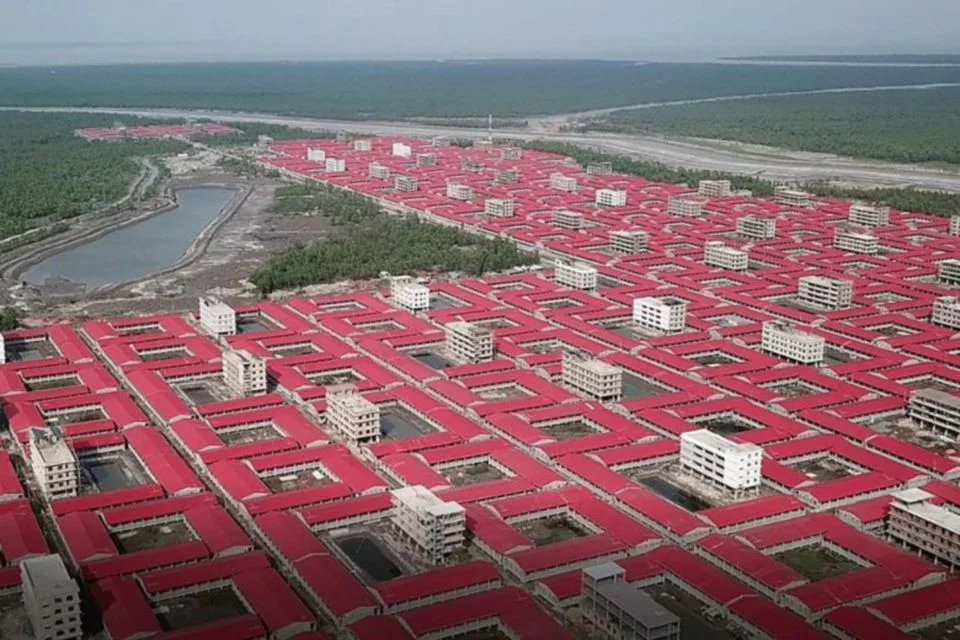 Pemandangan dari udara bangunan dicadang menempatkan pelarian Rohingya di pulau berlumpur Bhashan Char di Teluk Bengal. -Foto AFP