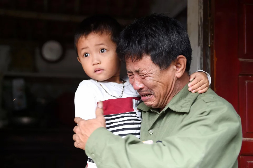 Le Minh Tuan, bapa Le Van Ha, 30, yang dibimbangi antara 39 maut dalam trak sejuk beku di Britain, menangis sambil mendokong cucunya di luar rumah mereka di wilayah Nghe An, Vietnam, hari ini. -Foto AFP