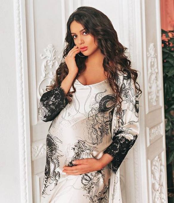Dalam sebuah foto, dia memakai gaun sutra dan renda sambil memperlihatkan kandungannya.