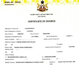 Ia menunjukkan perceraian itu didaftarkan di Singapura dan dilafazkan dengan talak tiga.