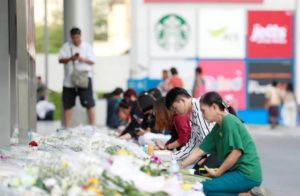 Seorang wanita yang membawa sebuah jambangan bunga dilihat bertafakur dan berdoa di luar pusat beli belah di bandar Nakhon Ratchasima, manakala beberapa pengunjung lain menandatangani kad ucapan dan saling berkongsi kesedihan.
